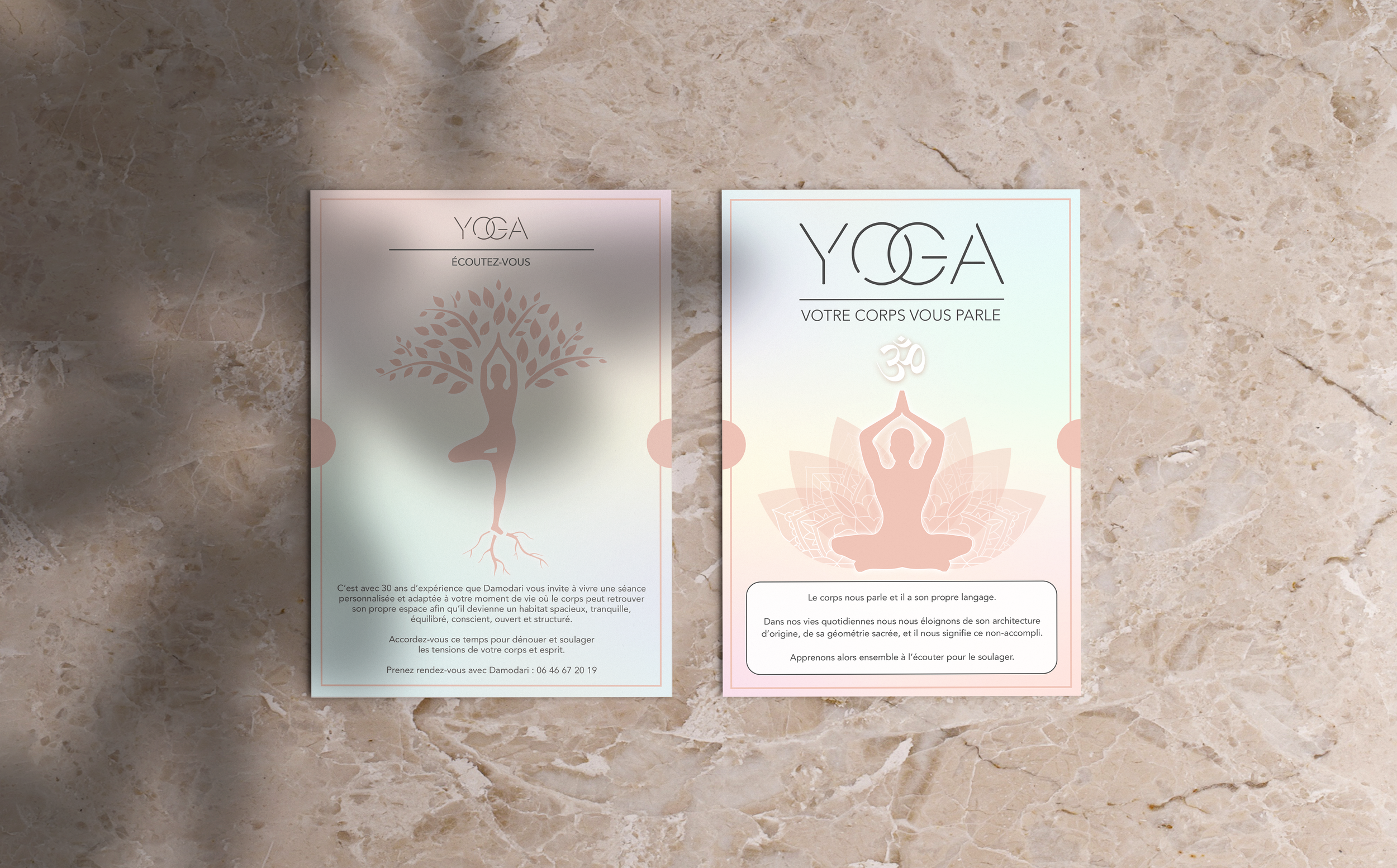 Flyers réalisés pour Damodari, professeure de Yoga.